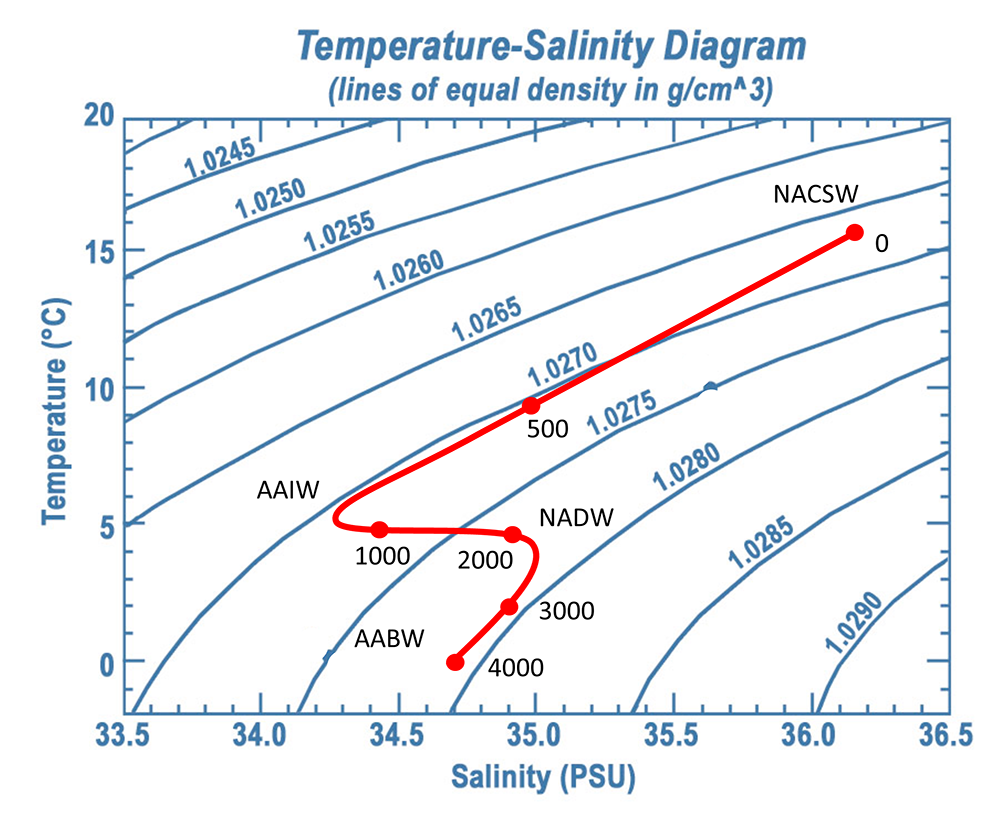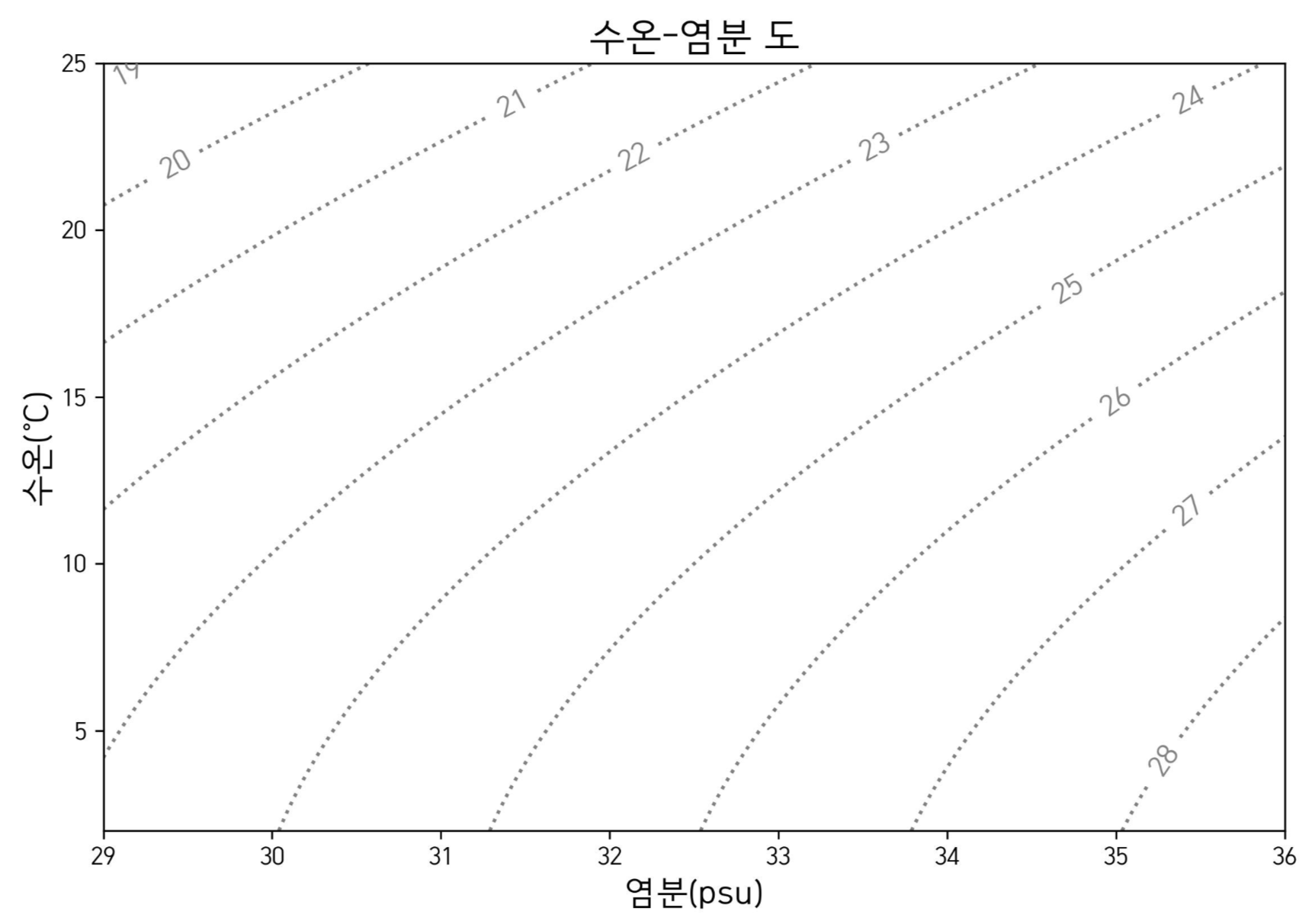 해양학자들이 바다를 연구할 때 많이들 사용하는 그래프로 수온 - 염분도라는 것이 있습니다. 교과서에서 수온 - 염분도라고 소개가 되어 있어 학생들은 이렇게들 많이 배우지만, T - S Diagram이라는 이름으로 많이 알려져 있습니다.