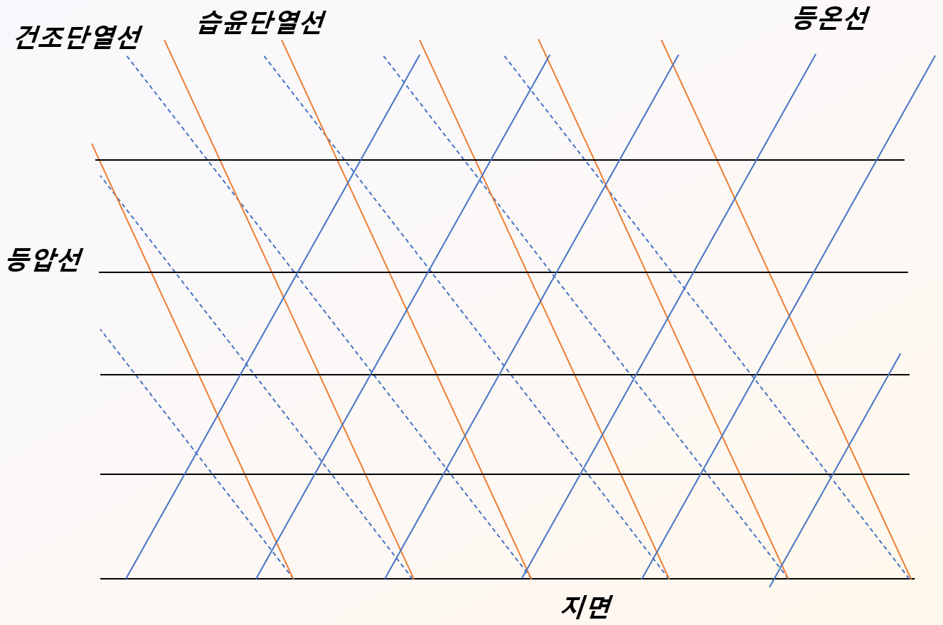 두 번째로 여기에 그려져야 할 선은 습윤단열선입니다. 습윤단열감율은 건조단열감율의 약 1/2배이기 때문에, 건조단열선보다 기울기가 작습니다. 추후 습윤단열선에 대한 포스팅을 할 때 다시 언급하겠지만, 엄밀히 말하면 습윤단열선의 기울기는 일정하지 않습니다. 고도가 높아지며 기울기가 급해지다가 건조단열선과 거의 평행이 됩니다.