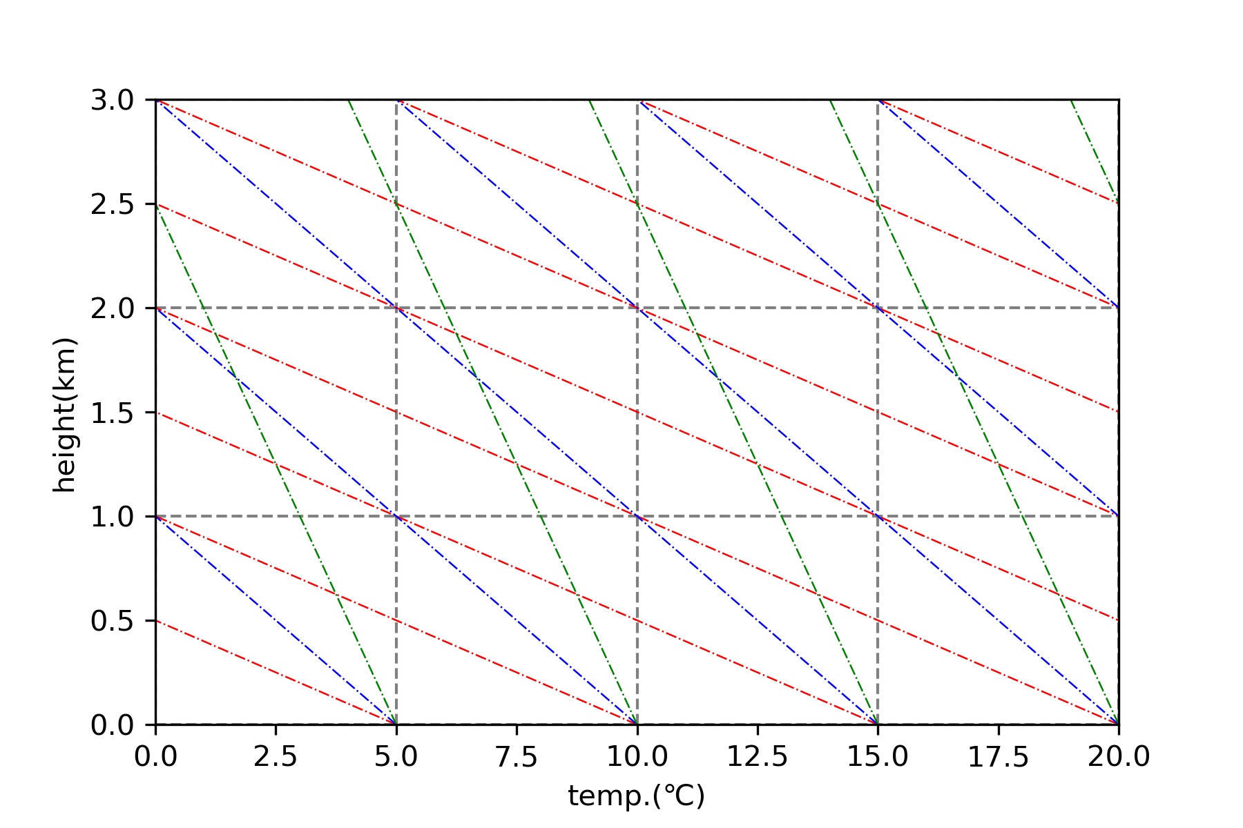 이제 마지막으로 여기에 이슬점 감율선(포화혼합비선)이 추가됩니다. 이슬점감률은 1km당 0.2℃씩 감소합니다. 따라서 기울기가 가작 작은데, 희안하게 건조단열선과 습윤단열선과는 다르게 마치 증가하는 방향의 기울기처럼 보입니다. 그런데 여기서 주의해야 합니다. 보통의 그래프에 익숙한 우리에게는 마치 고도 증가에 따라 온도가 증가하는것 처럼 보이지만, 온도선 자체가 저리 기울어져 있다 보니, 가만가만 따져보면 고도 증가에 따라 온도는 정상적으로 감소하게 되어 있습니다.