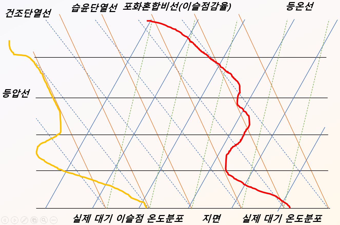 이게 이제 학생들이 지구과학2 시간에 배우는 단열선도와 배치되는 내용입니다. 학생들은 x축이 기울어지지 않은 수직인 온도, y축은 고도로 되어있는 단열선도를 배웁니다.